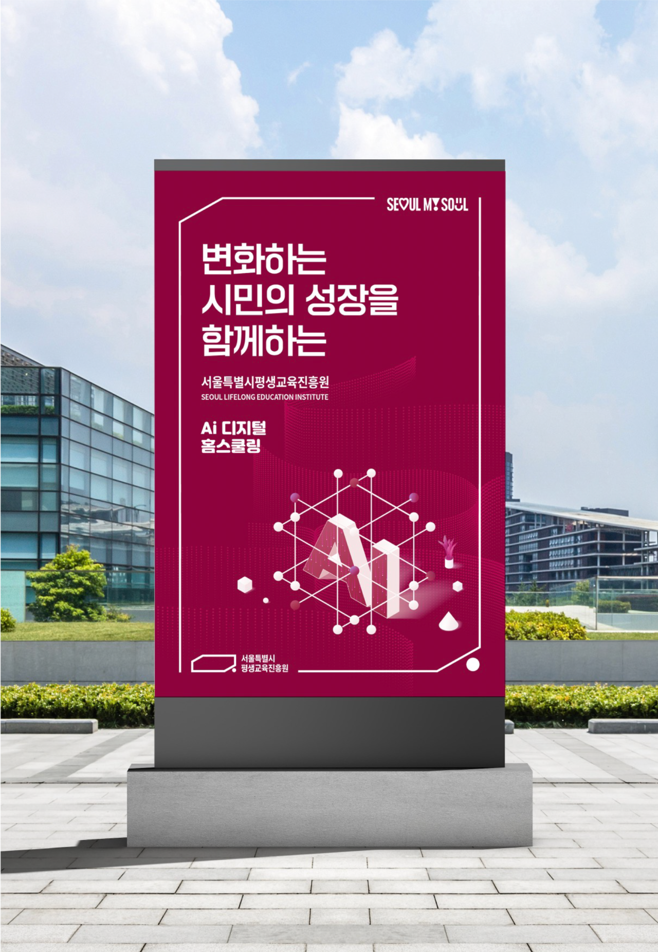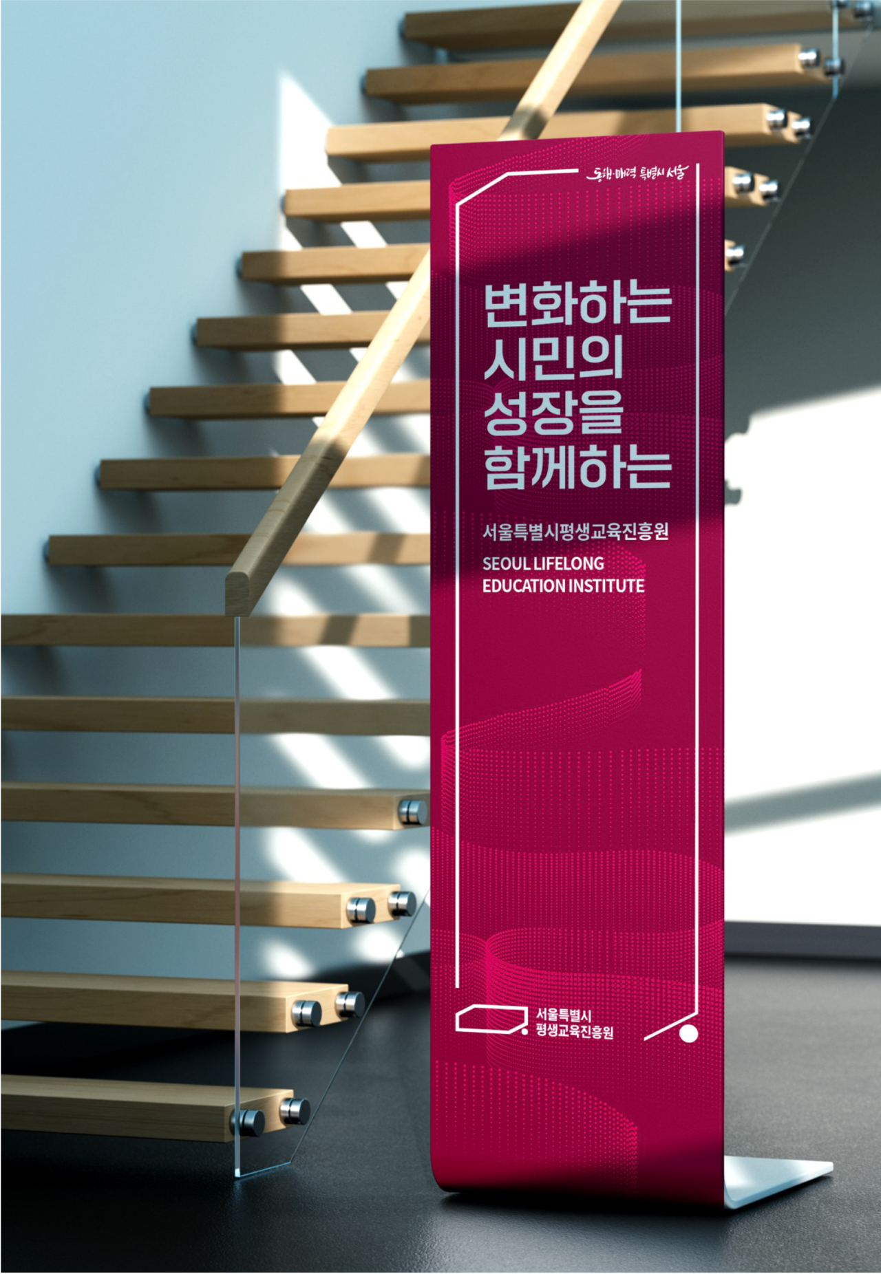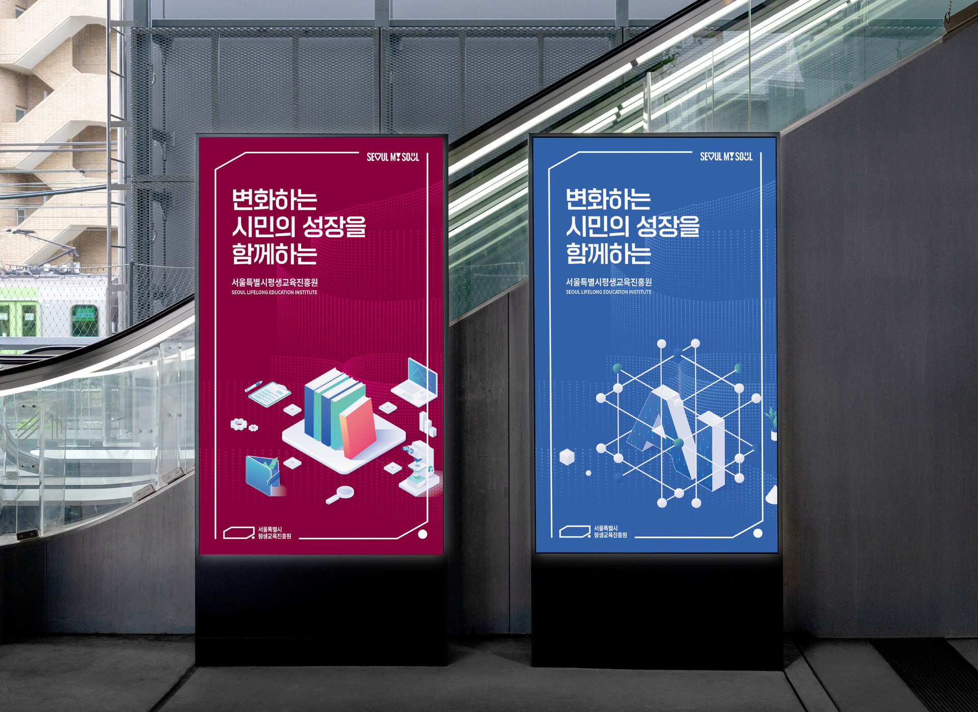 최종적으로 새롭게 개편된 BI는 서울시민의 평생학습을 대표하는 기관으로서의 정체성을 명확히 하고 활용성을 극대화했습니다. 심볼과 로고는 가독성과 확장성을 고려해 재설계되었고, 응용 매뉴얼은 공공기관 홍보물부터 디지털 채널까지 아우르는 통합 가이드로 완성되었습니다.