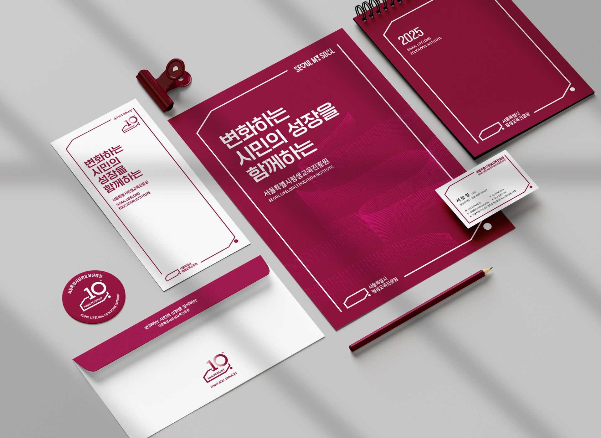 그래픽 모티브와 패턴은 ‘시민의 성장과 연결’을 시각화한 확장형 비주얼 언어로 개발되었으며, 10주년 기념 엠블럼은 기관의 역사와 비전을 기념하는 상징으로 제작되어 대내외 커뮤니케이션을 강화했습니다. 이를 통해 서울특별시평생교육진흥원은 브랜드 아이덴티티의 명확화와 브랜드 경험의 일관성 확보라는 두 가지 과제를 동시에 해결했고, 시민에게는 “함께 성장하는 평생학습 파트너”라는 메시지를 성공적으로 전달했습니다.
